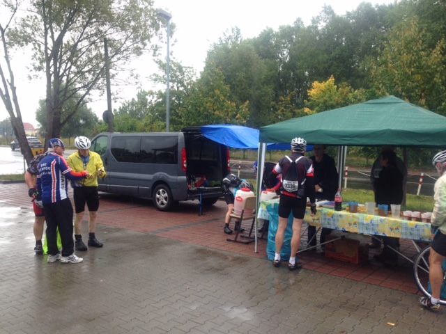 Nach etwa 140 Kilometer, überholt uns eine Gruppe von etwa acht Mann, an die wir uns dankbar dran hängen. Zu zweit zieht die Streckenlänge doch Energie, auch wenn wir über die gute Versorgung staunen. Und endlich verziehen sich auch die Wolken, die Sonne beginnt zu wärmen und zu trocknen, so dass wir Überschuhe und Regenjacke loswerden. Durch den westlichen Part der Strecke lassen wir uns von der Gruppe navigieren, dann sind wir so weit erholt, dass wir wieder Fahrt aufnehmen wollen. Ein letzter Halt bei Falkensee, wir holen den 5. Stempel. Es können nur noch wenige Kilometer sein. Wieder allein, zieht es sich doch, eine endlos lange Straße führt in zunehmendem Verkehr zurück zum Startort.