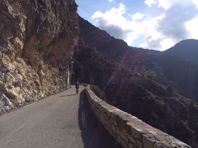 Die Strecke windet sich zunächst ein paar Kilometer talwärts, bevor wir wiederum nach links abbiegen, in Richtung des sagenumwobenen Col de Turini. Es ist der letzte Tag.