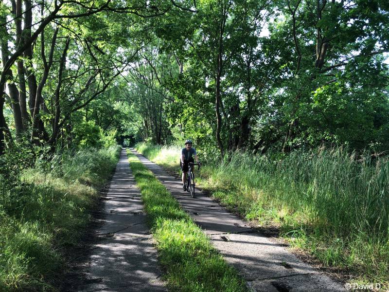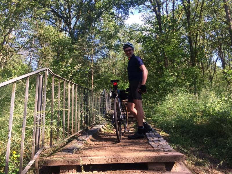 Ramponierter Asphalt, ein Foto von den Rädern vor der alten Lok, der Pfad durch den Wald. Es zieht sich rüber nach Prenzlau, irgendwann ist dann auch gut mit Pflaster, Kapelmuur, Belgien, Pavé, wir haben es kapiert. Aber schön ist es, wir können das nicht oft genug erwähnen.