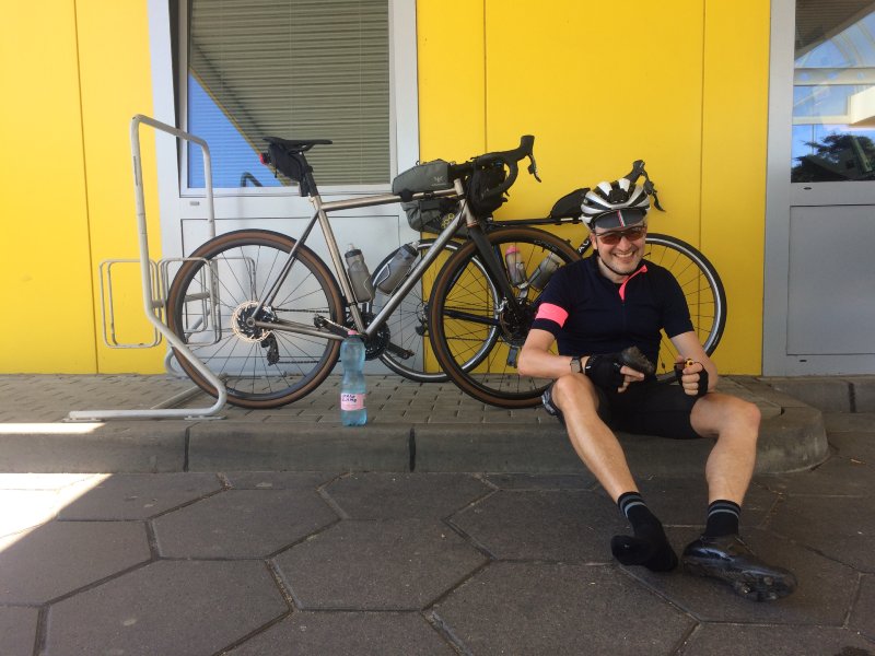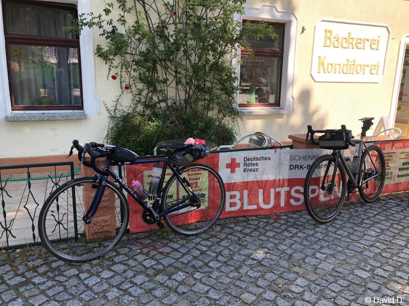 Letzter Halt in Marienwerder, ich brauche meinen Saftvorrat aus dem Saddle pack. Inzwischen bin ich müde, David ist erfreut und überlässt mir den Inhalt einer Flasche.