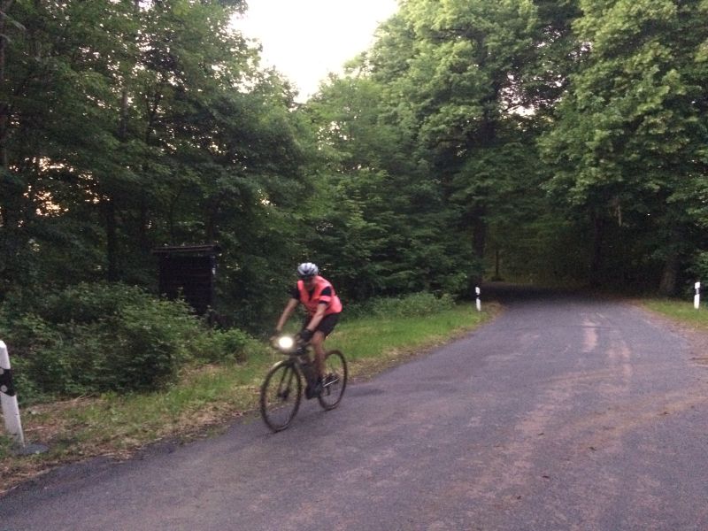 Wir sind spät dran, später als im Jahr davor, wo ich mich beeilt hatte, weil ich noch im Hellen durch den Wald hinter Altenhof wollte, den ich immer ein bißchen gruselig finde. David flucht auf die kaputte Straße bei Altkünkendorf, die wollte er nie mehr fahren, jetzt aber halt doch, ich nehme einen kleinen Anstieg mit voller Wucht, manchmal ist es toll, wenn da noch was ist in den Beinen, nach 300 Kilometern.