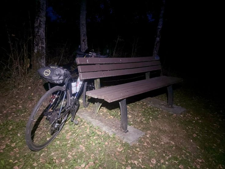 Zwei einsame Hütten im Wald lasse ich links liegen. Als es dämmert, bin ich auf einmal todmüde. Eine Bank mitten im Wald, eine Stunde ruhen und dann weitersehen. Ziehe die Folie, die ich sonst unterlege, als Windschutz über den Schlafsack.