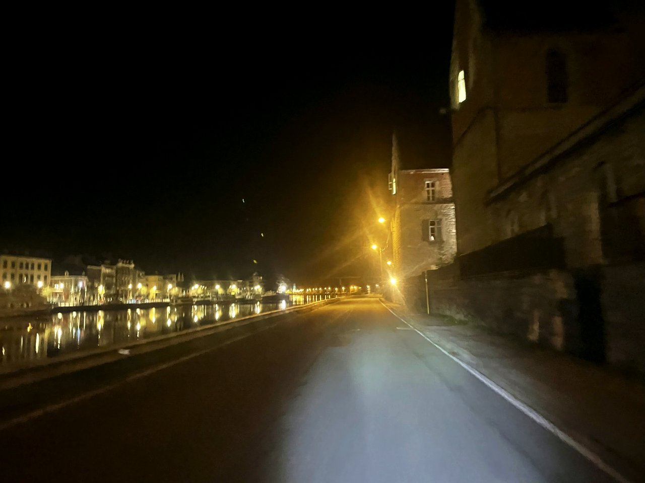 Nach 70 Kilometern ist es dunkel und ich halte an einem Imbiss. Die Leute starren mich an wie eine Außerirdische. Cola, Toilette, die Flaschen auffüllen. Die Hose macht keine Zicken. Finde mich schlau, weil ich in Dinant tatsächlich nichts direkt an der Straße finde. Erste gute Entscheidung.