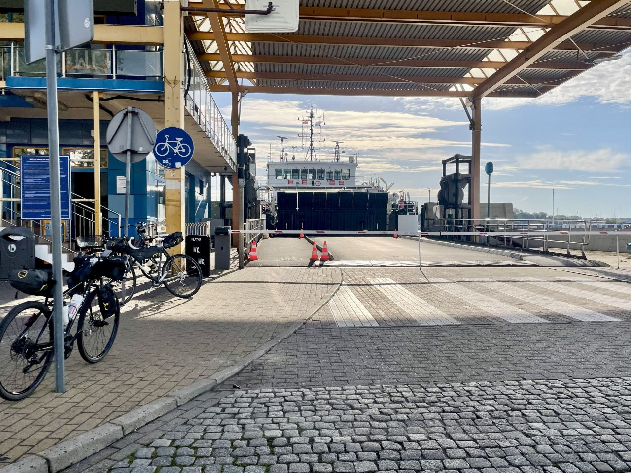 Natürlich sind wir viel zu früh an der Fähre. Sitzen auf einer Bank und in einem Café und beobachten das touristische Treiben. Die Fähre ist nur für Fuß- und Radverkehr. Über eine Schiene hieven wir die Räder an Bord.