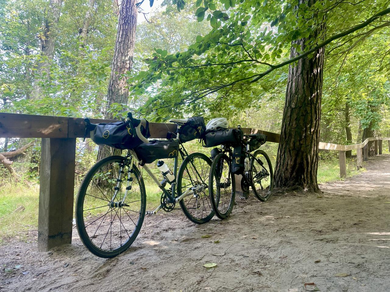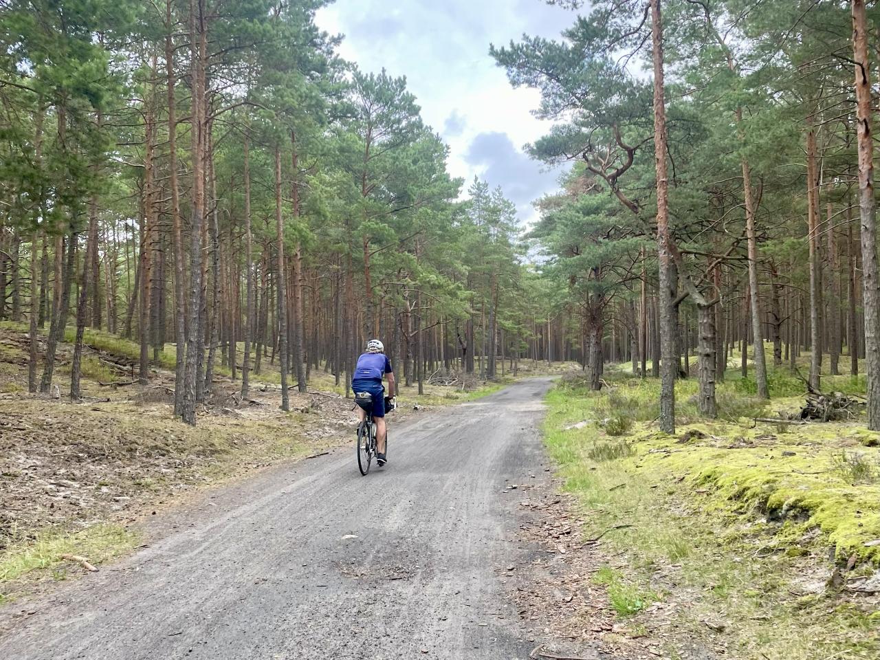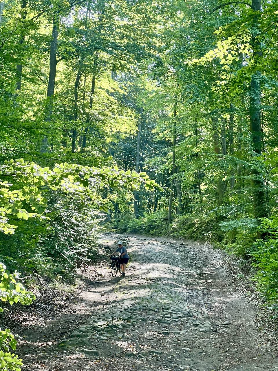Danach schwarzer Kies, und diese Wälder. Landschaftlich schon wieder eine beste Etappe. Die Reiseradler*innen sind deutlich weniger geworden. Ein paar Mountainbiker sehen wir noch, die wirken hier grundsätzlich mürrisch. Ob’s an der Haltung liegt, wie die da so auf den breiten Lenkern hängen?