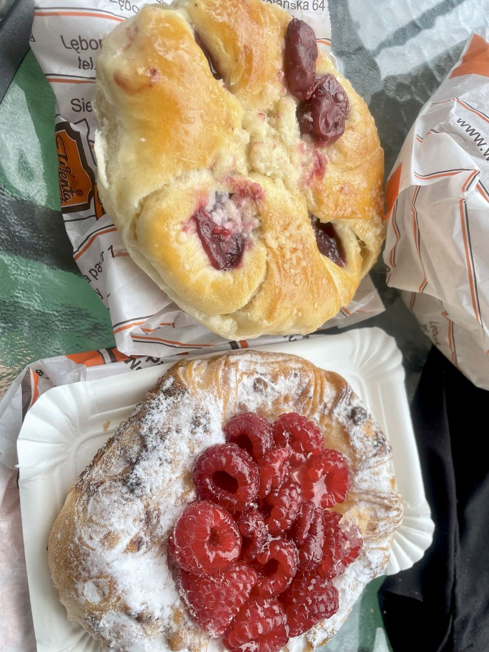 Am Ende zieht es sich trotzdem. Wolken ballen sich am Himmel, wir erreichen Białogóra gerade noch vor dem richtigen Regen. Beim Bäcker kaufen wir ein Hefe-Kirsch-Teil und ein Himbeer-Törtchen und lernen ein neues Wort: „Malina“.