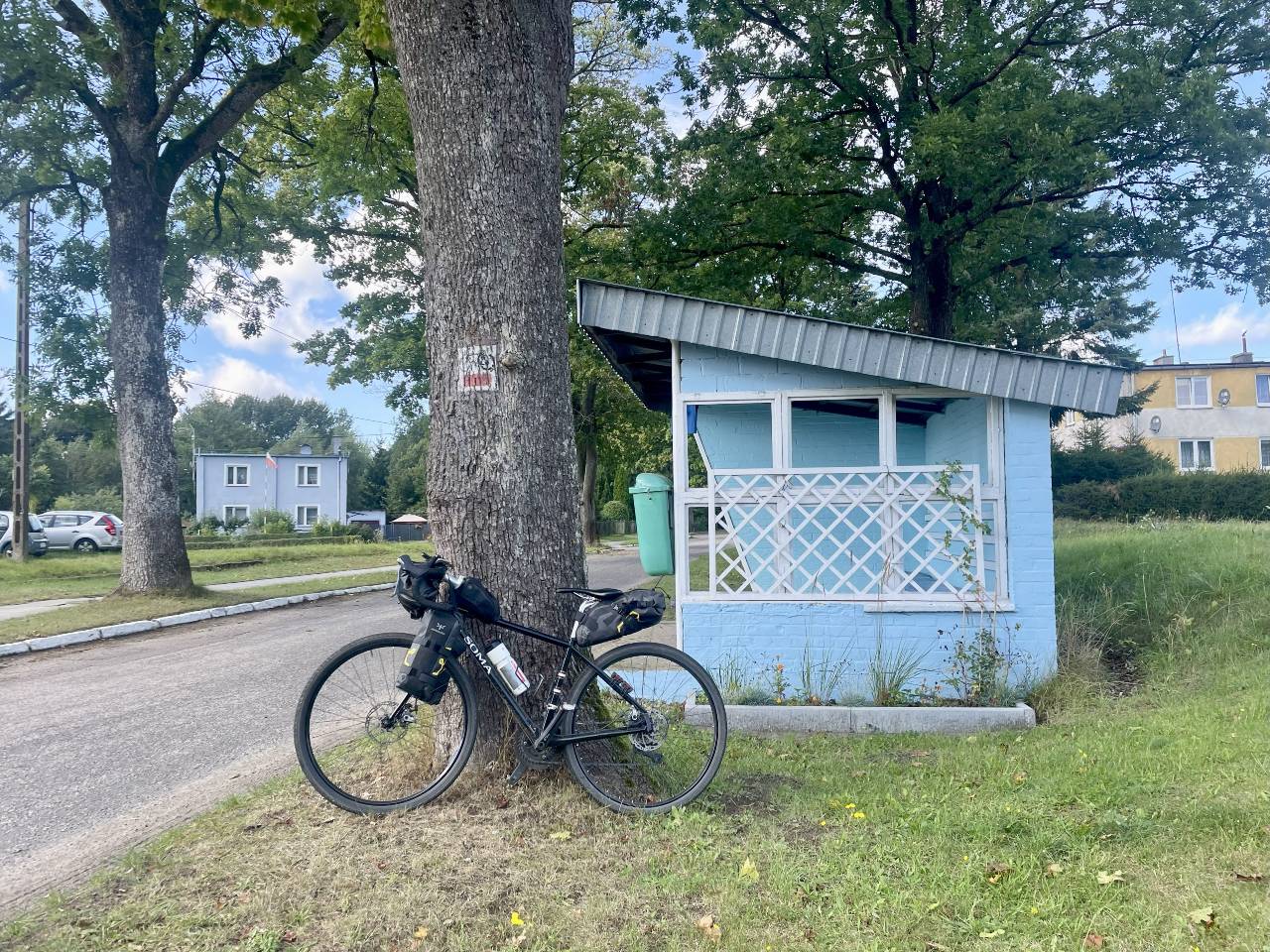 Vor Stettin dürfen wir auf einen letzten Waldweg. Wir wühlen uns über nassen Sand und Kieswege und an großen Pfützen vorbei. Im nächsten Ort regnet es so stark, dass wir kurz in einem Bushäuschen halten.