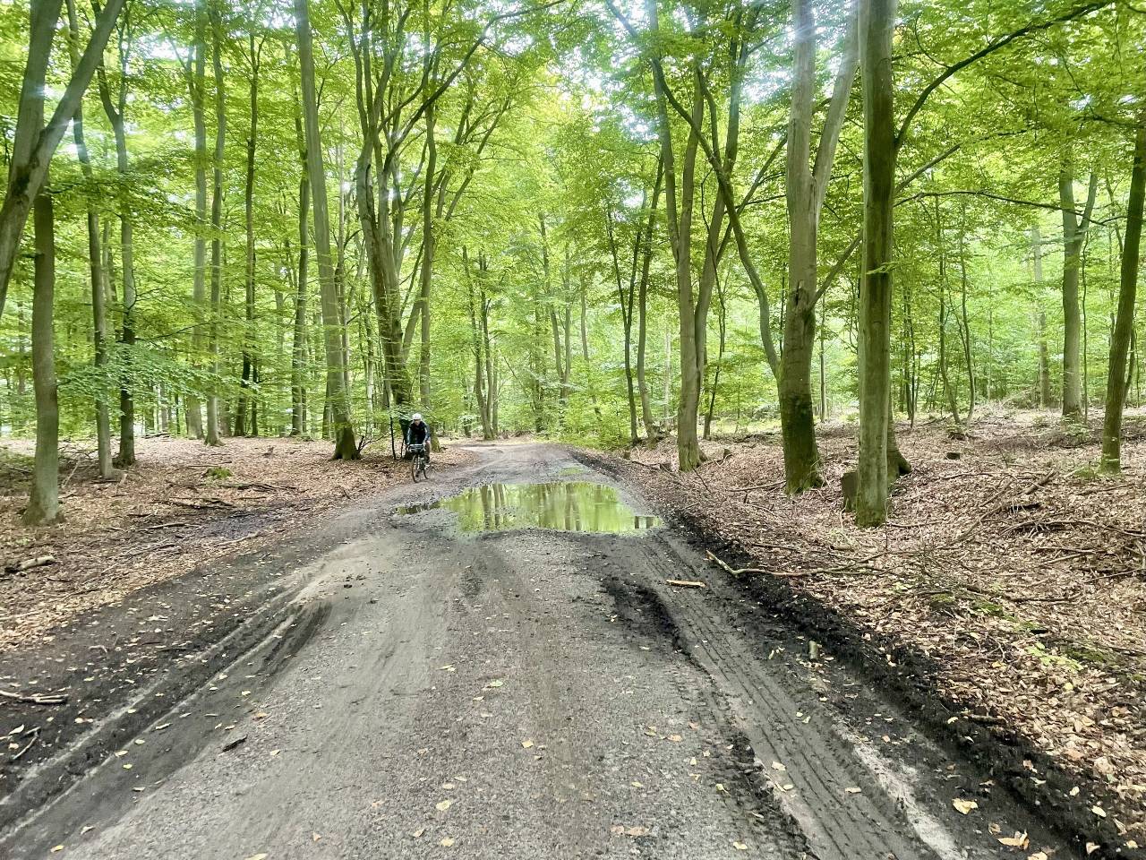 Zuerst noch fahren wir einsam durch den Wald, kurven um die Löcher voller Wasser herum.